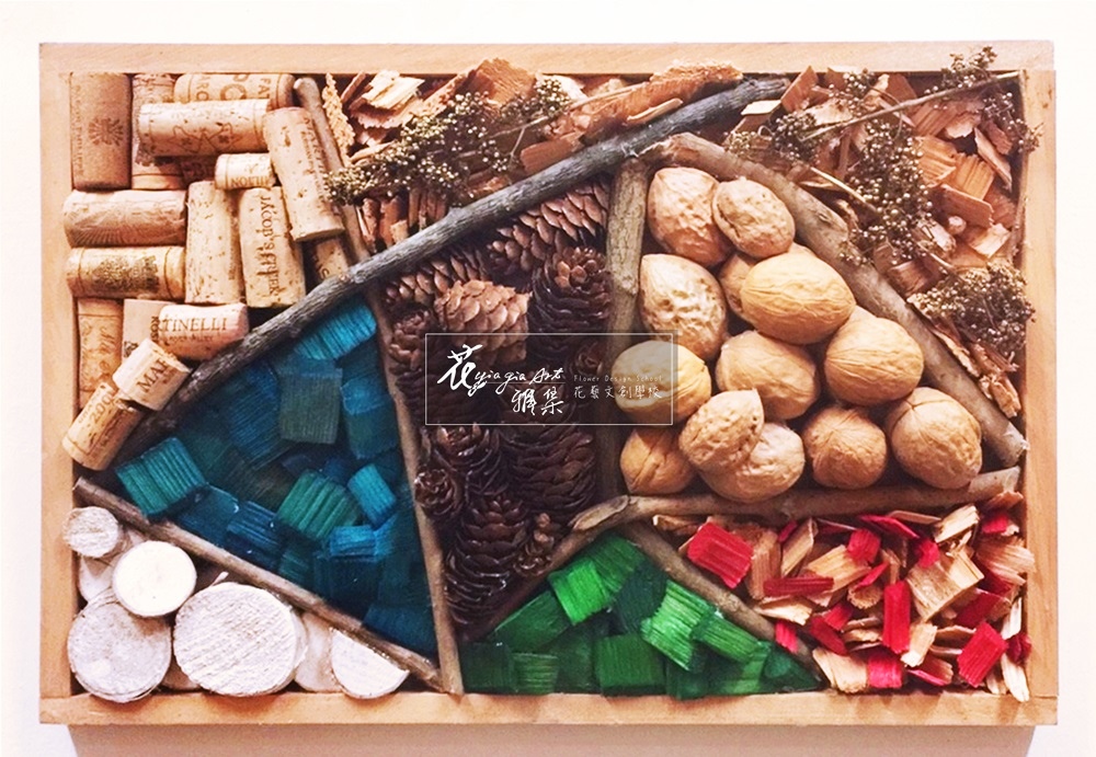 ‖當代複合媒材‖ 畫框切割的幾何圖形, 聚集不同樣式乾燥材, 使原本溫潤木料活潑生動。 林林總總的材料佐以色彩, 猶似大自然中的四季更迭。 --------------