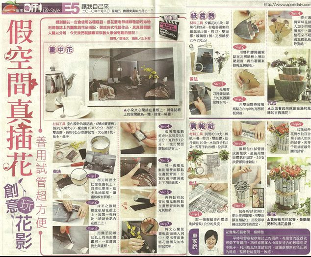 假空間真插花 創意玩花影善用試管超方便 提到插花一定會使用各種瓶器,但花藝老師楊婷雅卻巧妙地利用雜誌上的圖案與花朵搭配,做成各式花藝作品,真真假假讓人難以分辨,今天我們就請專家來教大家做有趣的插花! 報導╱鄧瑾又 攝影╱王永村
