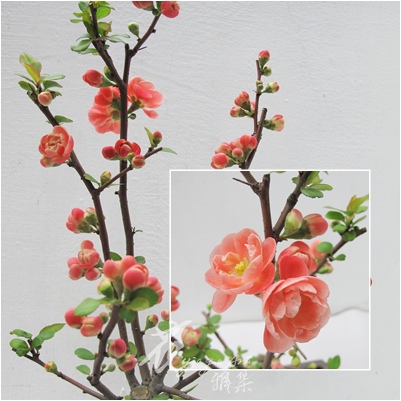 寒梅 Beautiful Floweringquince -------------------------------------------------------------- 中文名/ 寒梅(重辦木瓜花) 學名/ Chaenomeles speciosa (Sweet) Nakai 科別/ 薔葳科 大陸俗名/ 別名/ 長壽梅、貼梗海棠、刺梅、木瓜花 色彩/ 腥紅、緋紅、紅、淡紅、橙紅、白...等色 花期/ 冬-早春,多年生 瓶插觀賞期/ 10-30 days 買花要領/ 花苞多且枝態優美無折傷 特色及運用/ 姿態優雅,適合作線條花卉表現,修長線條上滿綴木瓜色的花朵,悄悄訴說著春天到來的腳步