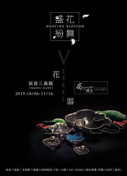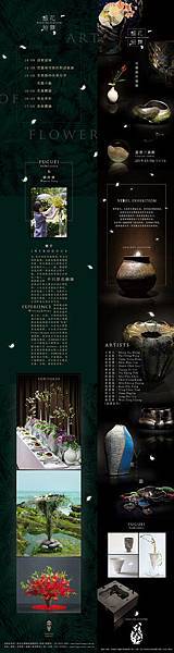 花藝與空間的對話戶外展演,由陶藝家張清淵教授─「風生水起」壁面陶板;花與器的室內展演美學分享,由陶藝家劉榮輝─山雨烏雲系列「行雲」花器。一片片墨綠雲朵,有平有凹高低起伏,如同祥雲般的,與花兒樹枝綠葉融合。應用織布釉與銅綠釉,以陶土呈現出天際變化莫測之雲,用似畫般的層層疊嶂有漂浮層次的創作,抽象卻又立體,佈置於藝文空間,陶與花藝結合,更散發東方文人氣息的感官世界。
