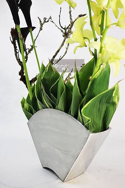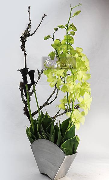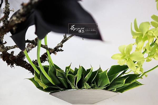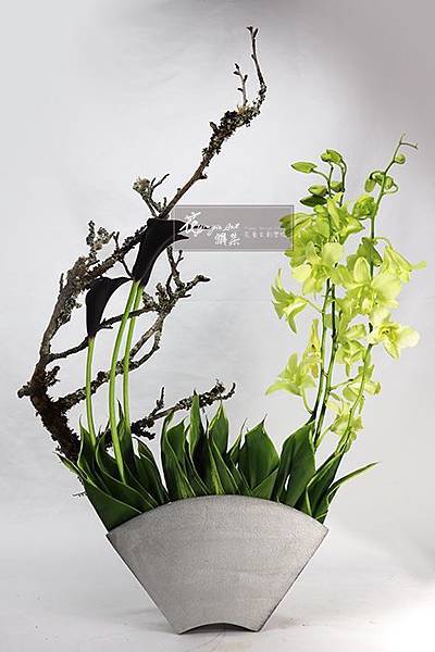 #蘋果苔木#白竹#海芋#石斛蘭#花藝設計#空間花設計#上海#台北#200421直播扇形花器#